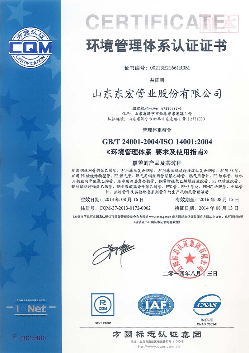 山東東宏管業(yè)股份有限公司單位性質(zhì)是股份有限公司(非上市、自然人投資或控股),成立于2008年1月21日(原山東東宏管業(yè)有限公司,2013年12月9日更名),是山東東宏集團有限公司(原成立于1997年8月4日的曲阜市東宏實業(yè)有限公司)的控股子公司,秉承了集團公司的企業(yè)文化及生產(chǎn)理念,是目前國內(nèi)專業(yè)生產(chǎn)礦用、瓦斯抽放用、燃?xì)庥?、油田用、電力工業(yè)用、基礎(chǔ)設(shè)施用、民用管材及各種配套管件系列產(chǎn)品的大型塑料管材生產(chǎn)基地。山東東宏管業(yè)股份有限公司主要產(chǎn)品有:鋼絲網(wǎng)骨架聚乙烯復(fù)合管、PE給排水管、給水用聚乙烯(環(huán)氧樹脂)涂層復(fù)合鋼管、PE礦用管、礦用聚乙烯(環(huán)氧樹脂)涂層復(fù)合鋼管、礦用聚乙烯(環(huán)氧樹脂)涂層螺旋焊接波紋復(fù)合鋼管、礦用PE纏繞結(jié)構(gòu)壁管、礦用鋼絲編織增強聚乙烯復(fù)合管、PE燃?xì)夤堋IP增強熱塑性塑料復(fù)合管、PE鋼帶增強螺旋波紋管、PP-R管、PP-R塑鋁穩(wěn)態(tài)管、PE-RT地暖管、PE超高耐磨管、鋼絲編織增強PE管、高壓橡膠管、雙點擊查看