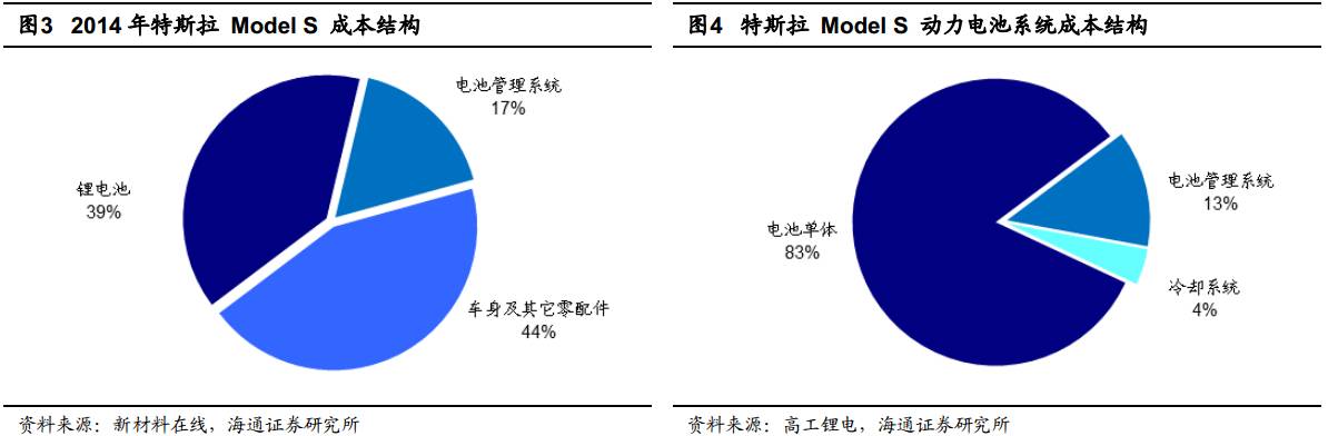 電池系統(tǒng)是電動車的動力來源,是整個產(chǎn)業(yè)鏈中最核心的系統(tǒng)成分。以特斯拉ModelS為例,其電池系統(tǒng)(鋰電池+電池管理系統(tǒng))成本占比為56%,而傳統(tǒng)的轎車發(fā)動機占比大約只有15%-25%。到了2016年,電池系統(tǒng)的成本占比有所下降,且成本結(jié)構(gòu)也有所變化,單體電池的成本占到了83%,電池管理系統(tǒng)的成本占比約為13%,剩余4%為電池冷卻系統(tǒng)。