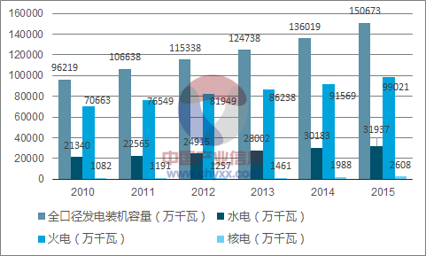 2015年我國電力全口徑發(fā)電裝機容量達(dá)到了150673萬千瓦,同比2014年的136019萬千瓦增長了10.77%。其中水電裝機容量31937萬千瓦,火電99021萬千瓦,核電2608萬千瓦
