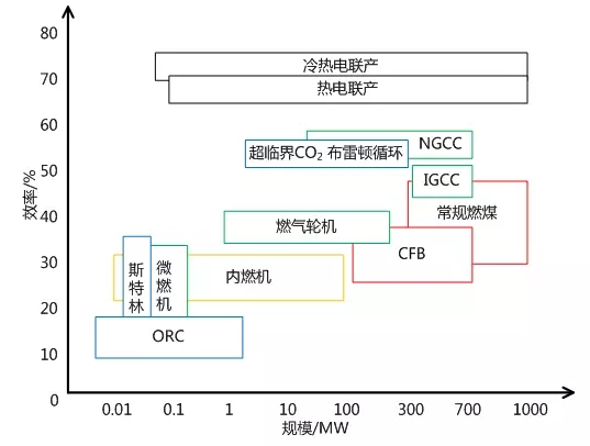 圖1 火力發(fā)電技術形式的效率與規(guī)模