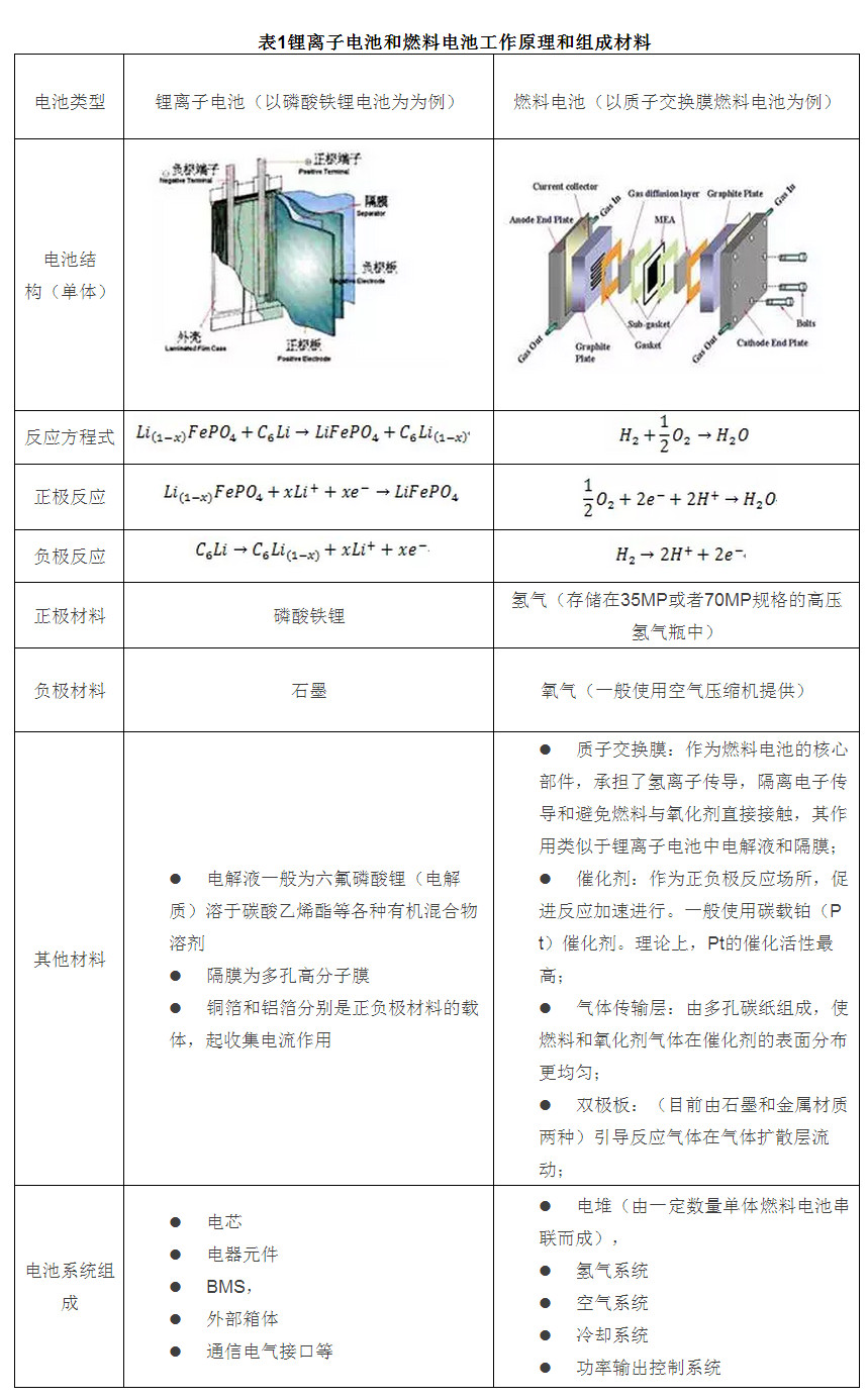 燃料電池其本質(zhì)是一種發(fā)電機,其燃料和氧化劑不經(jīng)過燃燒而直接通過電化學(xué)反應(yīng)轉(zhuǎn)化成電能。因此,燃料電池不受卡諾循環(huán)的限制,能量轉(zhuǎn)化效率高。燃料電池作為電能轉(zhuǎn)化裝置時,它的效率可以達(dá)到60%,甚至在作為熱電聯(lián)產(chǎn)裝置時它的效率高達(dá)80%。燃料電池按照其電解質(zhì)的不同分為堿性燃料電池(AFC),磷酸型燃料電池(PAFC),固體氧化物燃料電池(SOFC),熔融碳酸鹽燃料電池(MCFC),質(zhì)子交換膜燃料電池(PEMFC)。不同類型的燃料電池應(yīng)用領(lǐng)域和使用環(huán)境不同,質(zhì)子交換膜燃料電池的使用溫度范圍為室溫至80℃左右,目前在燃料電池車上使用的基本都是這種類型。以質(zhì)子交換膜燃料電池為例,發(fā)電時,正極氧氣和從負(fù)極傳導(dǎo)過來的氫離子以及外部電路傳導(dǎo)過來的電子結(jié)合生成水,負(fù)極氫原子失去電子變成氫離子和電子分別經(jīng)過電解質(zhì)和外部電路傳到正極。鋰離子電池和燃料電池基本原理、正負(fù)極材料等如表1所示。