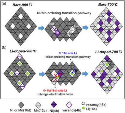 通過對中子衍射,TEM成像,電化學(xué)測試及NMR等數(shù)據(jù)的測試分析,Junghwa Lee等確定了Li摻雜對高壓尖晶石型LiNi0.5Mn1.5O4(LNMO)中Ni/Mn排列的影響。在有序轉(zhuǎn)變前摻雜的Li占據(jù)空的正八面體間隙(16c位置),在轉(zhuǎn)變后移動至正八面體位點(16d(4b)位置)。在16c位置的Li阻擋了有序轉(zhuǎn)變路徑,而在16d(4b)位置的Li則與過渡金屬產(chǎn)生靜電相互作用。因此Li位置的移動對Ni/Mn有序轉(zhuǎn)變有很強的影響。Li摻雜雖然對Mn3+影響不大,但是使Ni/Mn排列的無序性增強。Li摻雜LNMO的有序-無序轉(zhuǎn)變發(fā)生在700°C。Li摻雜在對Mn3+電化學(xué)性質(zhì)無負效應(yīng)的情況下可以調(diào)控Ni/Mn的無序性。