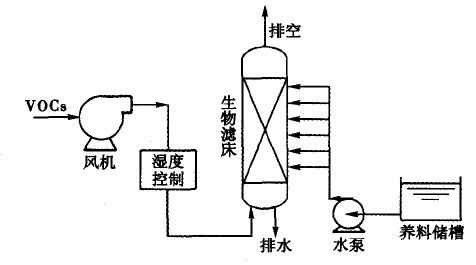 生物過濾法處理VOCs,這種有機廢氣,主要是工業(yè)生產、市政污水、污泥處理的主要來源。為了治理惡臭氣體,提出了生物過濾法這種技術,近年來,隨著科學的發(fā)展,發(fā)現(xiàn)這種處理方法對處理VOCs也有較好的效果。這種生物過濾法,可以處理較低濃度的VOCs,核心處理設備是生物濾床的作用(如圖1所示),VOCs可以在生物濾床中得到處理,使VOCs生成CO:和HO,這主要是由于在濾床內,已經裝有能形成生物膜的填料,這些填料可以使VOCs在濾床里被生物膜上的生物經過吸附作用,將VOCs分解成CO2和H2O,使它們排放到空氣中得到凈化。