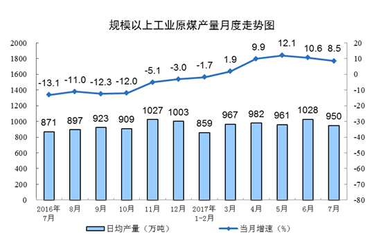 7月份,原煤產量2.9億噸,同比增長8.5%,繼續(xù)保持較快增長,但比6月份回落2.1個百分點;日均生產950萬噸,比6月份減少78萬噸。1-7月份,原煤產量20.1億噸,同比增長5.4%。
