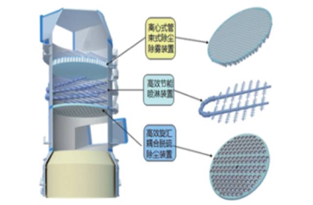 單塔一體化脫硫除塵超低排放技術(shù)是旋匯耦合裝置、高效噴淋系統(tǒng)和管束式除塵除霧裝置的有機結(jié)合,通過三者合理配置獲得最佳運行狀態(tài)。旋匯耦合裝置為高效噴淋層提供均勻的煙氣流場,利于提高噴淋層的脫硫效率;旋匯耦合裝置與高效噴淋一起為管束式除塵除霧裝置提供最優(yōu)的進口條件,保證管除的除塵除霧效率。