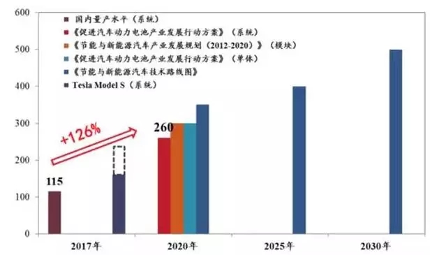 目前,國內(nèi)新能源汽車仍然在采用磷酸鐵鋰(BYD為主)和三元鋰電池,車型續(xù)航里程基本上都能夠達(dá)到300公里,但是電池系統(tǒng)平均能量密度水平僅為115Wh/Kg。而2017年3月份,國家工信部等四部委聯(lián)合頒布《促進(jìn)汽車動(dòng)力電池發(fā)展行動(dòng)方案》,指出到2020年,要求新型鋰離子動(dòng)力申池單體比能量超過300Wh/Kg;系統(tǒng)比能量力爭達(dá)到260Wh/Kg。