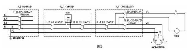 故障現(xiàn)象:照明回路能正常用電,插座回路用電時,ALY中的插座漏電開關(guān)跳閘,有時AL1中的總漏電開關(guān)也跳閘。