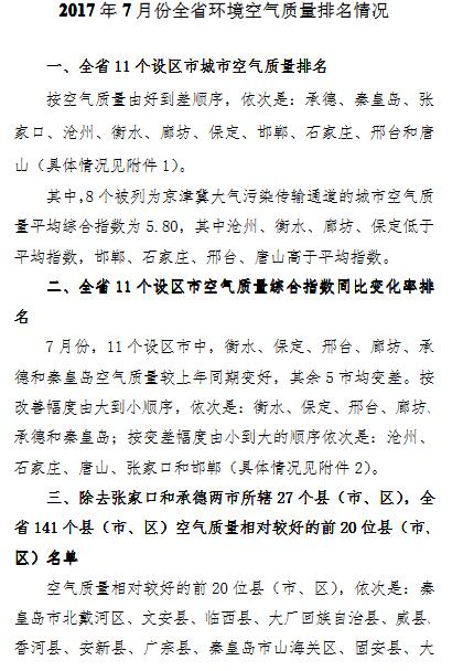 橙電網環(huán)保網獲悉,河北省環(huán)保廳公布了2017年7月全省環(huán)境空氣質量排名情況。根據監(jiān)測數(shù)據,按空氣質量由好到差排序,依次是:承德、秦皇島、張家口、滄州、衡水、廊坊、保定、邯鄲、石家莊、邢臺和唐山