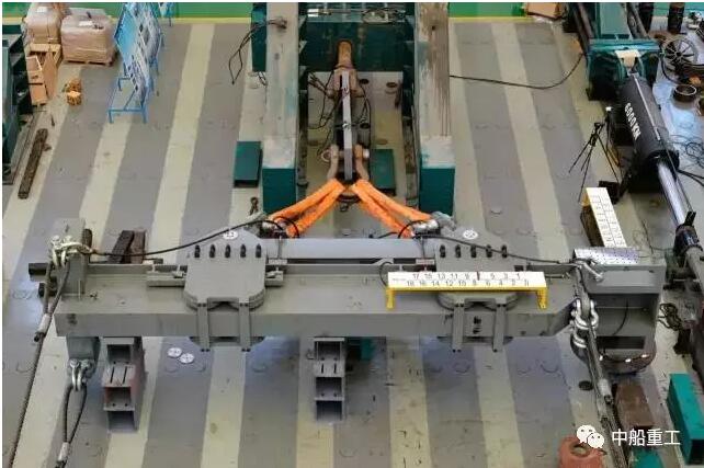 該吊具重達(dá)35噸,外形復(fù)雜,且客戶要求在吊具加載過(guò)程中實(shí)時(shí)改變整套試驗(yàn)系統(tǒng)的受力狀態(tài),這對(duì)試驗(yàn)的實(shí)施是一個(gè)重大挑戰(zhàn)。七二所打破傳統(tǒng)模式,結(jié)合現(xiàn)有試驗(yàn)設(shè)施,設(shè)計(jì)加工了隨動(dòng)連接裝置、吊具翻轉(zhuǎn)裝置、吊具緊固裝置及橫向移動(dòng)降摩擦裝置等工裝,建立了滿足吊具智能調(diào)節(jié)的功能試驗(yàn)方法,成功解決了吊具智能調(diào)節(jié)考核技術(shù)的難題,圓滿完成試驗(yàn),得到客戶的一致好評(píng)。