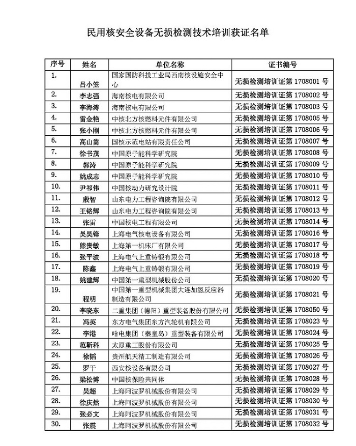 原標(biāo)題:民用核安全設(shè)備無損檢測(cè)技術(shù)培訓(xùn)獲證名單