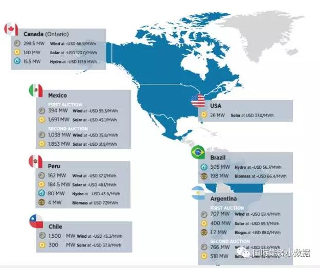 根據(jù)國(guó)際可再生能源署最新發(fā)布的《可再生能源競(jìng)價(jià)分析報(bào)告》,2016年各國(guó)可再生能源項(xiàng)目(包括陸上風(fēng)電、海上風(fēng)電、光伏、水電、生物質(zhì)發(fā)電、地?zé)幔┳畹透?jìng)價(jià)如下圖所示: