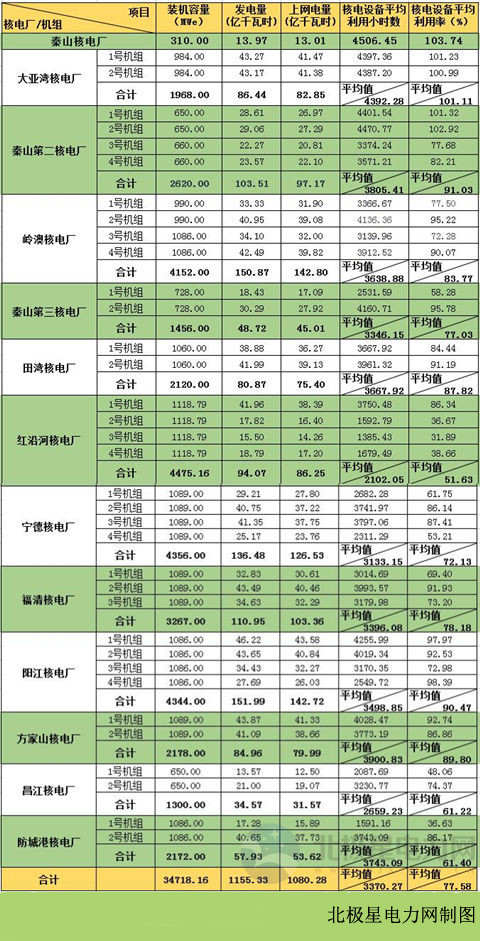 從《2017年1-6月36臺商運(yùn)核電機(jī)組電力生產(chǎn)情況統(tǒng)計表》中發(fā)現(xiàn),紅沿河、寧德、昌江和防城港核電基地的設(shè)備利用率明顯低于平均值。其中,紅沿河2、3、4號機(jī)組和防城港1號機(jī)組設(shè)備利用率未超過40%,昌江1號機(jī)組和寧德4號機(jī)組設(shè)備利用率分別為48.06%和53.21%。2017年1-6月36臺商運(yùn)核電機(jī)組設(shè)備平均利用率為77.58%,對比2016年同期(我國投入商業(yè)運(yùn)行的核電機(jī)組共30臺,設(shè)備平均利用率為76.36%),新增6臺商運(yùn)機(jī)組,而設(shè)備利用率僅增1.22個百分點(diǎn)。這不禁讓人想起,2016年全年,全國核電機(jī)組按發(fā)電能力可生產(chǎn)2428億度電,但由于各種因素限制,實(shí)際完成的計劃電量1829億度,參與市場交易消納137億度,總計損失電量462億度,棄核率達(dá)19%,相當(dāng)于近7臺核電機(jī)組全年停運(yùn)。