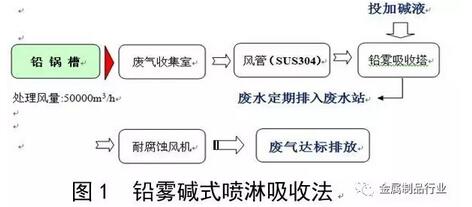 鉛霧治理采用堿性溶液吸收凈化法,此法結(jié)構(gòu)簡單,運行可靠、效率高,但廢水量較大。工藝過程見圖1.
