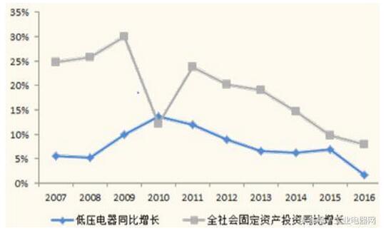 低壓電器市場(chǎng)規(guī)模增長(zhǎng)和全社會(huì)固定資產(chǎn)投資增長(zhǎng)對(duì)比