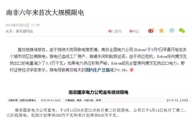 2016年,Eskom宣布公司已經(jīng)徹底扭轉(zhuǎn)電力短缺局勢(shì),電力處于供過(guò)于求的狀態(tài)。南非各行業(yè)應(yīng)對(duì)電力供應(yīng)前景保持樂(lè)觀,繼續(xù)投資興業(yè)。