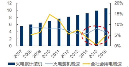 用電需求增速放緩,新增煤電裝機亟待遏制:2014年起火電裝機增速高于全社會用電增速,供給過剩導(dǎo)致效率下降2016年火電利用小時創(chuàng)新低:較歷史平均低20%,較尖峰水平低40%。