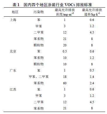 在噴漆涂裝過程中高壓空氣噴射的油漆絕大部分停留在工件上,其他未到達噴涂表面的噴霧微粒與溶解噴漆微粒的水珠懸浮在空氣中,以及噴涂過程中產(chǎn)生的揮發(fā)性有機化合物形成噴漆廢氣污染環(huán)境。由于不同油漆涂料所用溶劑不同,因而在噴涂過程中產(chǎn)生的廢氣組分也不同。以汽車噴涂為例檢測出15種VOCs,包括苯系物(甲苯、二甲苯等)、酯類(乙酸乙酯、乙酸丁酯等)、酮類(甲基異丁基酮)和醚類(乙二醇丁醚)等。北京、上海、廣東、江蘇等地針對涂裝行業(yè)VOCs排放制定了相應標準,見表1。