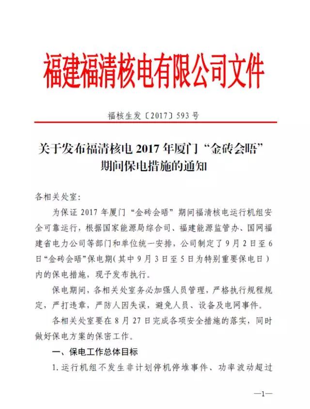 9月3日至5日,金磚國(guó)家領(lǐng)導(dǎo)人第九次會(huì)晤在福建廈門舉辦。作為福建省裝機(jī)規(guī)模最大的核電企業(yè)——中國(guó)核電投資控股的福清核電累計(jì)發(fā)電380億千瓦時(shí),相當(dāng)于少消耗標(biāo)準(zhǔn)煤約1227萬噸,減排二氧化碳約4008萬噸,相當(dāng)于植樹造林約11萬公頃。為保用電安全,福清核電上下高度重視,及時(shí)發(fā)布金磚會(huì)晤期間保電措施: