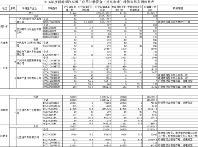 9月7日,工信部發(fā)布“關(guān)于2016年度新能源汽車推廣應(yīng)用補(bǔ)助資金(補(bǔ)充申請)初步審核情況的公示”,2016年企業(yè)申報的新能源汽車推廣數(shù)為71446輛,企業(yè)申請的清算資金為32.08億元,專家組核定的推廣數(shù)為71199輛,應(yīng)清算補(bǔ)助資金為31.43億元。電池成箱型號與公告不一致、行駛里程存疑、電池單體型號、電池組總能量與公告不一致等是被專家組核減原因
