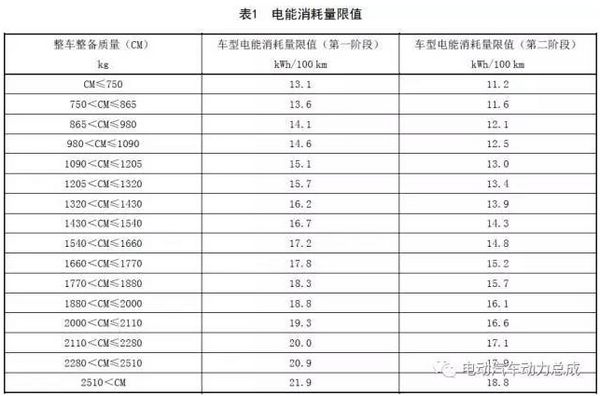 表中體現(xiàn)兩個階段的電能消耗限值,其中第一階段限值的目的是淘汰落后技術車型,第二階段限值的目的是促進先進技術車型的發(fā)展。在沒有國外同行標準參考,通過測試試驗與總結(jié),在全球范圍內(nèi)第一次提出,還是要跟中汽研及各位同行點個贊的。