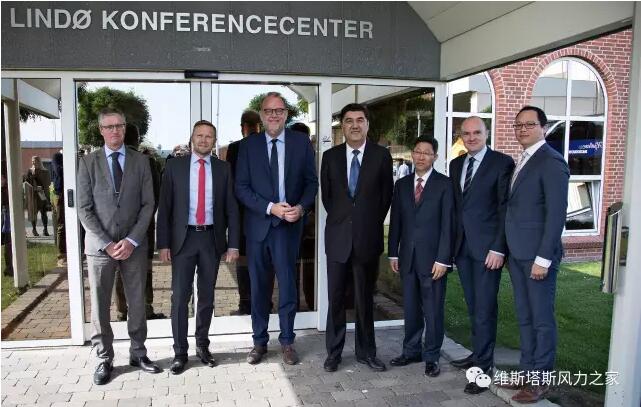 會(huì)見和參觀前,努爾˙白克力(右四)與丹麥能源、公用事業(yè)和氣候大臣利勒霍特(右五)、維斯塔斯中國總裁楊錁寶(右三)、維斯塔斯集團(tuán)高級(jí)副總裁 Morten Dyrholm(右二)等合影。