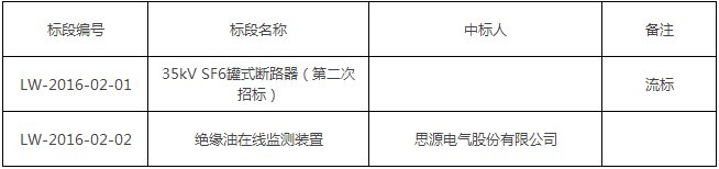 南方主網(wǎng)與海南電網(wǎng)第二回聯(lián)網(wǎng)工程第二批物資招標(biāo)(招標(biāo)編號:LW-2016-02)工作已完成,經(jīng)評標(biāo)委員會評審、推薦,并經(jīng)公示無異議,招標(biāo)人確定以下單位為中標(biāo)人,涉及SF6罐式斷路器、絕緣油在線監(jiān)測裝置等設(shè)備: