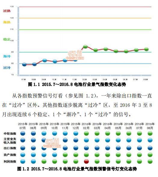 2015年3月至8月中輕電池景氣指數(shù)連續(xù)6個(gè)月在“過冷”區(qū)運(yùn)行,9月至12月在“漸冷”區(qū)運(yùn)行,2016年2月起在電池利潤、資產(chǎn)指數(shù)增長的影響下,中輕電池景氣指數(shù)上升至“穩(wěn)定”區(qū)。2016年8月中輕電池景氣指數(shù)為92.59 ,與7月91.94相比上漲0.65個(gè)百分點(diǎn)。