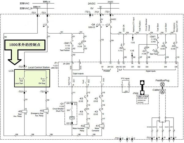 圖中黃色的區(qū)域有兩個手動控制按鈕,它們位于1800米之外,它們下方的繼電器則用于本地的控制。這兩個開關(guān)安裝得如此之遠(yuǎn),會對系統(tǒng)產(chǎn)生何種影響?