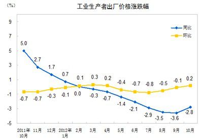 2012年10月份,全國工業(yè)生產(chǎn)者出廠價格同比下降2.8%,環(huán)比上漲0.2%。工業(yè)生產(chǎn)者購進(jìn)價格同比下降3.3%,環(huán)比上漲0.1%