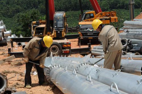 施工人員正對鋼管桿擰緊螺絲。曾子權(quán)攝