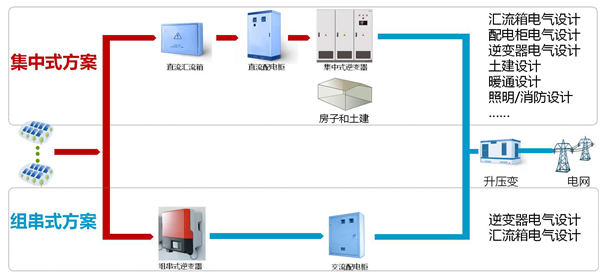 圖1組串式和集中式方案電站結(jié)構(gòu)對(duì)比
