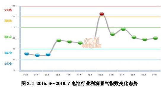 2016年7月電池利潤景氣指數(shù)為100.17,較5月的98.96上漲1.21個百分點。