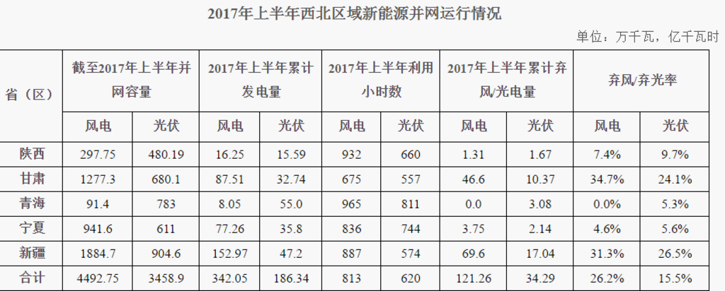 2017年上半年,西北五?。▍^(qū))新增光伏發(fā)電并網(wǎng)容量422.49萬(wàn)千瓦,截至2017年上半年,累計(jì)并網(wǎng)容量3458.9萬(wàn)千瓦,占全網(wǎng)總裝機(jī)的13.88%。2017年上半年,光伏發(fā)電量186.34億千瓦時(shí),占全網(wǎng)總發(fā)電量的5.61%;利用小時(shí)數(shù)620小時(shí),棄光電量34.29億千瓦時(shí),棄光率15.5%。西北及五?。▍^(qū))棄光率依次為:陜西9.7%、甘肅24.1%、青海5.3%、寧夏5.6%、新疆26.5%。