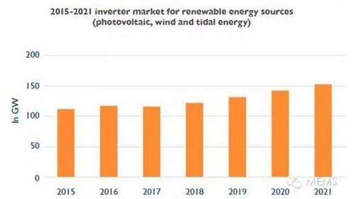 可再生電力能源的大規(guī)模部署,正在催生新的市鋤遇。對(duì)光伏和風(fēng)能逆變器的需求將維持在較高水平。根據(jù)市場研究機(jī)構(gòu)Yole預(yù)計(jì),至2021年,光伏、風(fēng)能和潮汐能逆變器市場將超過152GW(十億瓦特發(fā)電裝機(jī)容量)。
