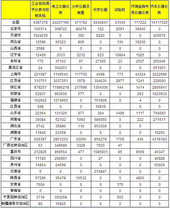 上海儀器儀表行業(yè)協(xié)會發(fā)布2012年1-3月儀器儀表主要子行業(yè)各地產(chǎn)量比較,第一季度,全國生產(chǎn)工業(yè)自動化調(diào)節(jié)儀表與控制系統(tǒng)4387378臺,電工儀器儀表24207196臺,環(huán)境監(jiān)測專用儀器儀表117222套。