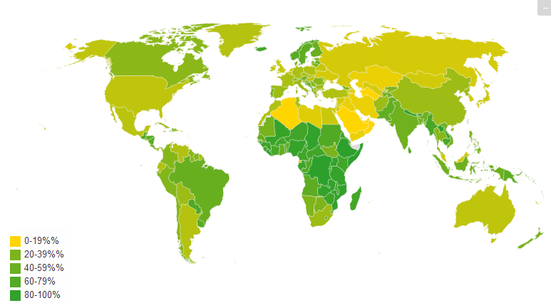 日前,指數(shù)研究機(jī)構(gòu)Indy100和 Anchor Pumps根據(jù)世界銀行發(fā)布的1996-2016年期間各國(guó)可再生能源比例數(shù)據(jù)庫(kù)繪制了全球最終能源消耗中可再生能源使用地圖。