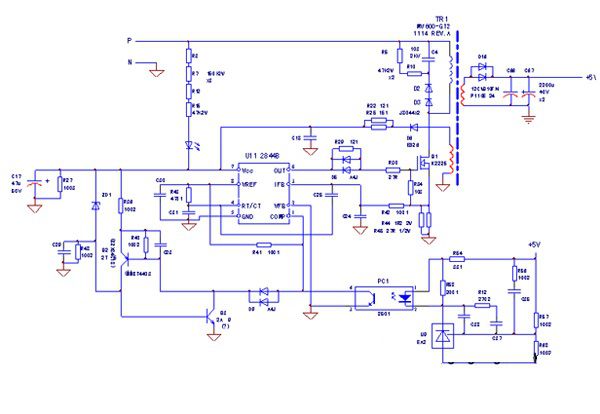 這是一個故障特型。只在單獨檢修開關電源/驅動板時,才會碰到。檢修難度為幾星,我就不說了。如下圖電源所示,①該反饋光耦的輸出側直接與3844的12腳相連;②開關變壓器二次繞組,尤其是采樣電壓繞組的濾波電容,其容量較為,為千微安級。當負載支路空載時,因不能形成最小的穩(wěn)定負載電流,致使能源供給一方因失去供給目標,而無所適從,不是配給多了就是配給少了,也就形成了間歇振蕩。