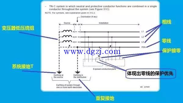 由于電路中有系統(tǒng)接地,但負(fù)載外殼沒有直接接地,而是通過零線PEN間接接地,所以該接地系統(tǒng)叫做TN-C。