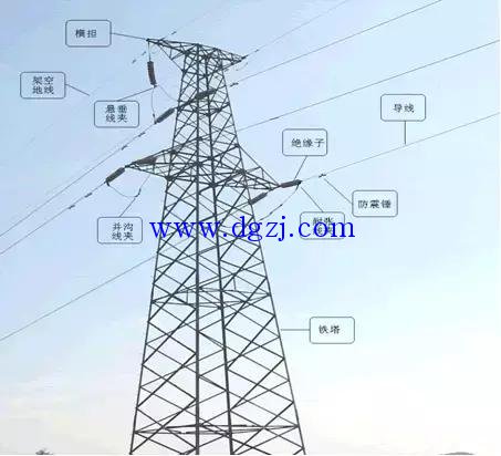 架空輸電線路的主要部件有: 導(dǎo)線和地線(含OPGW)、桿塔、絕緣子、金具、桿塔基礎(chǔ)、拉線和接地裝置等組成,如下圖:
