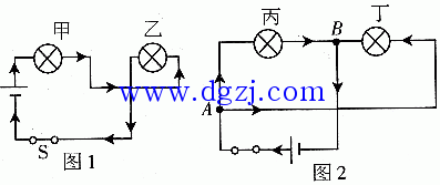 解析:圖1中電流從正極流向負(fù)極只有一條通路,故甲、乙兩燈為串聯(lián)。在圖2中,電流從電源的正極流向負(fù)極有兩條路徑,A為分流點(diǎn),B為合流點(diǎn),故丙、丁兩只燈為并聯(lián)。