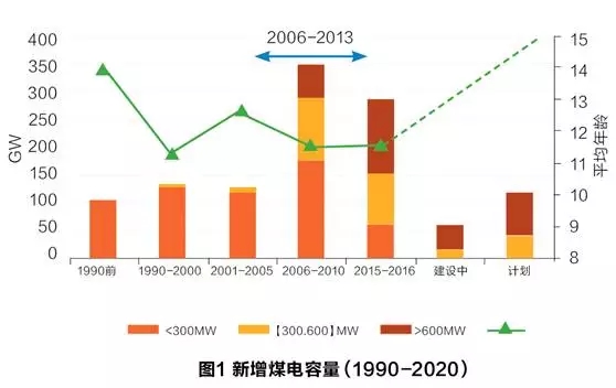 可以預(yù)見,在市場環(huán)境下,這些大機(jī)組將是“虧錢”(missing-money)的那部分機(jī)組,生不逢時,屬于不折不扣的“落后產(chǎn)能”。那么,這部分產(chǎn)能有多大呢?卓爾德Draworld研究中心對過去與今后5年預(yù)期的煤電增長,根據(jù)容量大小做了可視化的工作(圖1)。從2006年算起,到2016年的這十年,超過60萬千瓦的新建超臨界機(jī)組超過1.5億以上。整體煤電機(jī)組的平均年齡11-12歲。