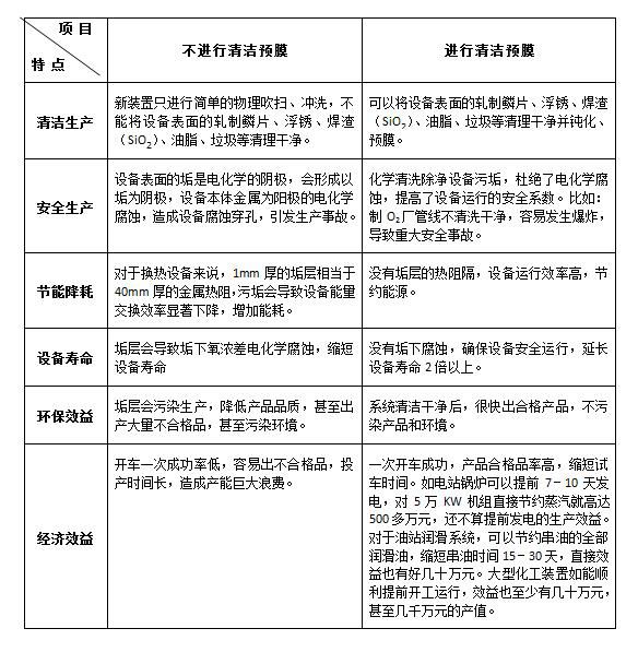 下面列表通過清潔生產(chǎn)、安全生產(chǎn)、節(jié)能降耗、設(shè)備使用壽命、環(huán)保效益、經(jīng)濟(jì)效益6方面對清洗預(yù)膜與不清洗預(yù)膜進(jìn)行對比,這樣可以更清楚的看出新裝置開車前清洗預(yù)膜的必要性。