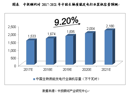 中投顧問對2017-2021年中國生物質(zhì)能發(fā)電行業(yè)裝機容量預測