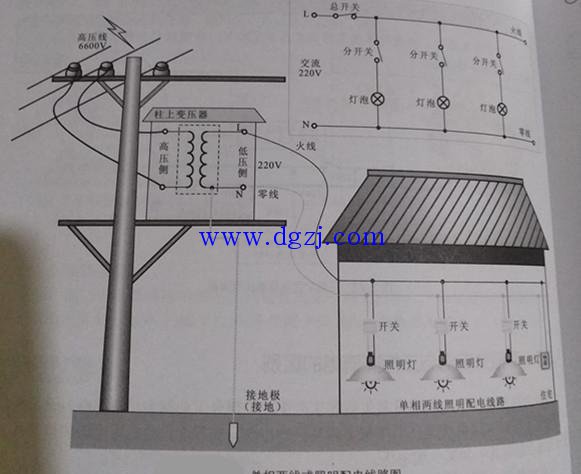 從三相三線高壓輸電線上取其中的兩線送入高壓變壓器,變壓后(降壓,如由高壓6600V變?yōu)?20V)向家庭照明線路提供220V電壓,變壓器初級與次級隔離,輸出端火線與零線之間的電壓為220V。