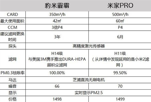 豹米霾霸與米家Pro兩款空氣凈化器都采用了高精準激光傳感器,高精準激光傳感器可以使凈化器更精準的分析出空氣中顆粒物的濃度。霾霸凈化效率為每小時350m3,略小于米家Pro的每小時500m3。不過霾霸的濾網為醫(yī)療級DURA-HEPA超容塵濾網,它的CCM(累計凈化量)為36000mg是新國際規(guī)定ccm的最高別P4(12000mg以上)的3倍,米家Pro采用了和小米空氣凈化器2一樣的濾網,差于豹米霾霸。PM0.3去除率上豹米可以做到100%,相比米家Pro的99.50%略高一籌。