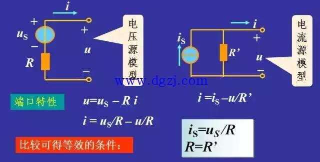 實際電壓源、實際電流源兩種模型可以進行等效變換,所謂的等效是指端口的電壓、電流在轉(zhuǎn)換過程中保持不變。