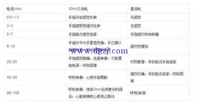 電擊對人體的危害程度,(http://www.dgzj.com/ 版權(quán)所有)主要取決于通過人體電流的大小和通電時間長短。電流強度越大,致命危險越大;持續(xù)時間越長,死亡的可能性越大。能引起人感覺到的最小電流值稱為感知電流,交流為1mA,直流為5mA;人觸電后能自己擺脫的最大電流稱為擺脫電流,交流為10mA,直流為50mA;在較短的時間內(nèi)危及生命的電流稱為致命電流,如100mA的電流通過人體1s,可足以使人致命,因此致命電流為50mA。在有防止觸電保護裝置的情況下,人體允許通過的電流一般可按30mA考慮。