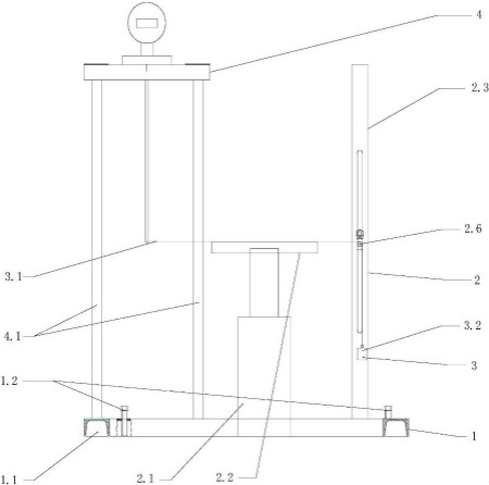 本實(shí)用新型的目的是由以下技術(shù)方案實(shí)現(xiàn)的:一種插入式靶式流量計(jì)的離線校驗(yàn)裝置,其特征在于:一支撐機(jī)構(gòu)、安裝在支撐機(jī)構(gòu)上的調(diào)平機(jī)構(gòu)、配重機(jī)構(gòu)、安裝機(jī)構(gòu),其中,支撐機(jī)構(gòu)包括:一機(jī)座、安裝在機(jī)座上的機(jī)座調(diào)平螺桿;調(diào)平機(jī)構(gòu)包括:垂直安裝在機(jī)座上的調(diào)平支架、設(shè)置在機(jī)座上的千斤頂、安裝在千斤頂上的水平參考平板,其中,調(diào)平支架上安裝有一調(diào)平螺桿,調(diào)平螺桿的一端鎖緊在調(diào)平支架上,調(diào)平螺桿的另一端定位有一定滑輪;配重機(jī)構(gòu)設(shè)有:軟鋼絲,軟鋼絲的一端與插入式靶式流量計(jì)的靶桿相連,另一端穿過(guò)定滑輪與配重箱連接;安裝機(jī)構(gòu)包括:垂直安裝在機(jī)座的支柱,安裝在支柱上的安裝臺(tái)、鑲嵌在安裝臺(tái)上的鋼板尺。