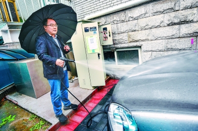 昨天秋雨綿綿,記者來到位于車公莊西路的北京市水科學技術(shù)研究院。離地下車庫入口處不遠,矗立著一臺外形類似加油機的控制柜,柜體后是一個胖墩墩的鐵皮集雨箱。這套設備就是水科院自主研發(fā)的自助雨水洗車機,上個月剛剛投用。上面貼著的使用記錄顯示,平均每天有2輛車在此洗去塵埃。