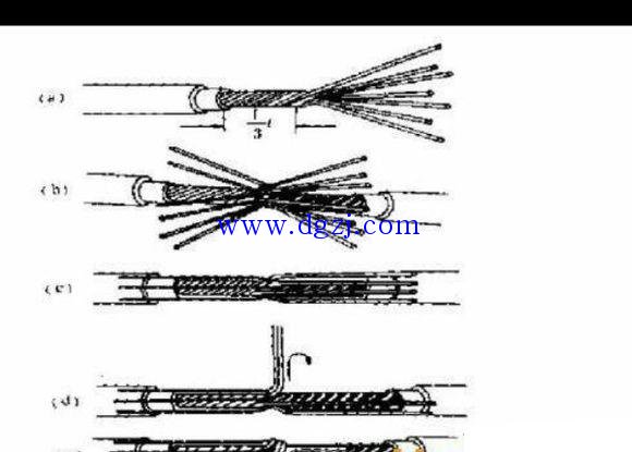 第2種方法:一字接法,也稱七星接法。把接頭撥出100MM,在50MM位置順序拉直,做成傘骨的樣子,再與同樣的另一根多股線每隔一股相互交叉到底,然后合攏來,用本身股線一一纏繞,每股剩下來的線頭和下一股線交叉后作為被裹的線壓在下面,最后一段纏完后擰小辮收尾,纏繞時應排列整齊,不要相互重迭。